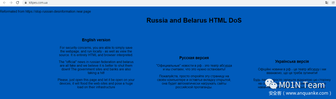 该网站在传播扩散后,也引起了其他网站的效仿,https://www.kitpes.com.ua/标明其修改自https://stop-russian-desinformation.near.page。该网站在左上角标注了是原网站的重构页面,目标是对俄罗斯和白俄罗斯进行DDOS攻击,同时将DDOS的目标列表扩展到了166个。虽然保持了原有功能,但是页面的排版比较混乱。