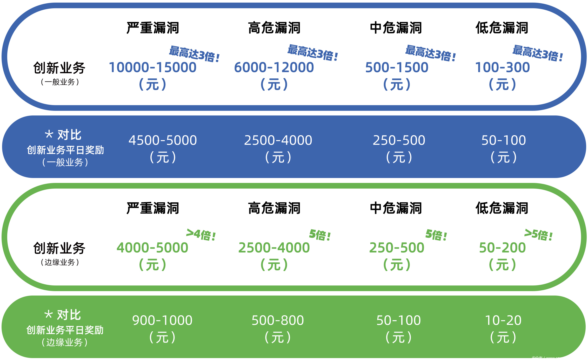 活动期间,创新业务相关有效漏洞&情报最高奖励达15000元。尤其是创新业务边缘业务,此次活动均高于4倍,甚至5倍,高到小编直呼额滴神啊!业务范围详细说明https://security.immomo.com/blog/182