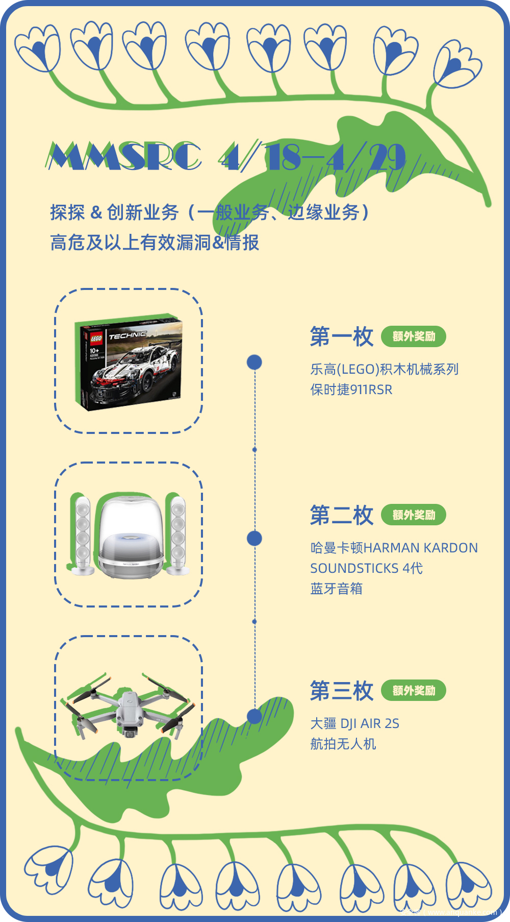 活动期间,提交探探OR创新业务(一般业务&边缘业务)相关有效高危/严重漏洞&情报,还会额外奖励给大家超豪华奖品!如下图: