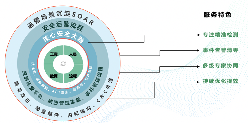 专业安全分析:充分利用客户侧部署的终端、边界、流量等防护设备与安全专家能力为企业提供完善的安全运营流程与常态化运营机制,有助于跟上不断发展的对抗性策略和技术的步伐; -