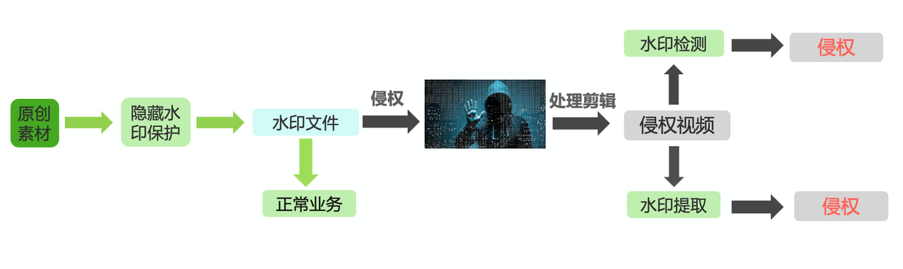 版权保护技术是指针对盗版侵权行为的确权存证以及监测、取证等技术。当前,区块链、人工智能、数字水印等版权保护应用主要集中在版权确权、监测、取证等环节;其中数字水印技术在版权确权、版权监测环节有着重要应用价值,数字水印具有查找侵权、追根溯源的能力,相比其他技术可以进一步实现对侵权行为的追踪溯源。