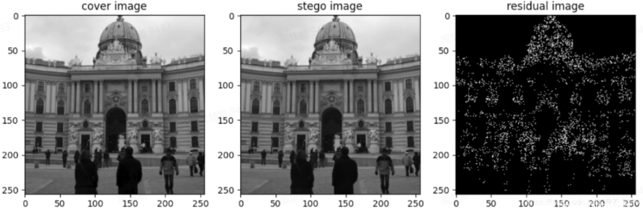 左图为载体图像,中间为载密图像,右图为差异图像(载体图像与载密图像之间的差异图像)。