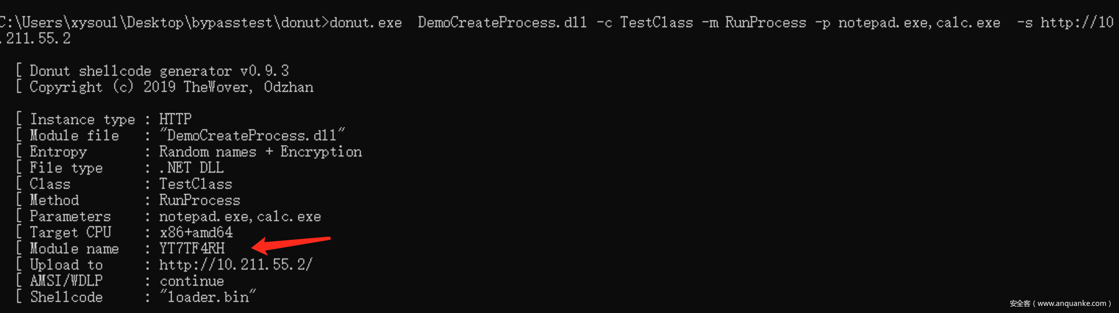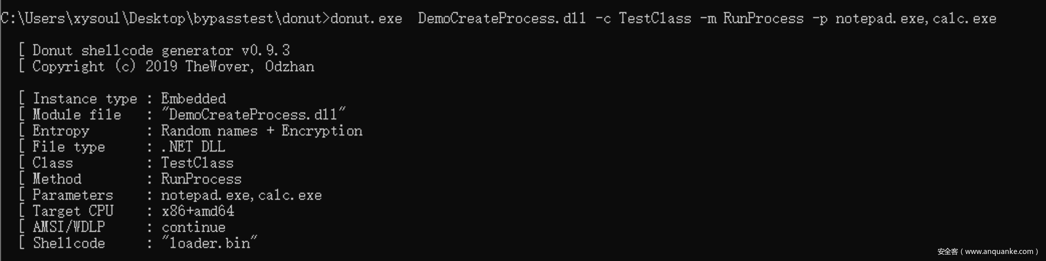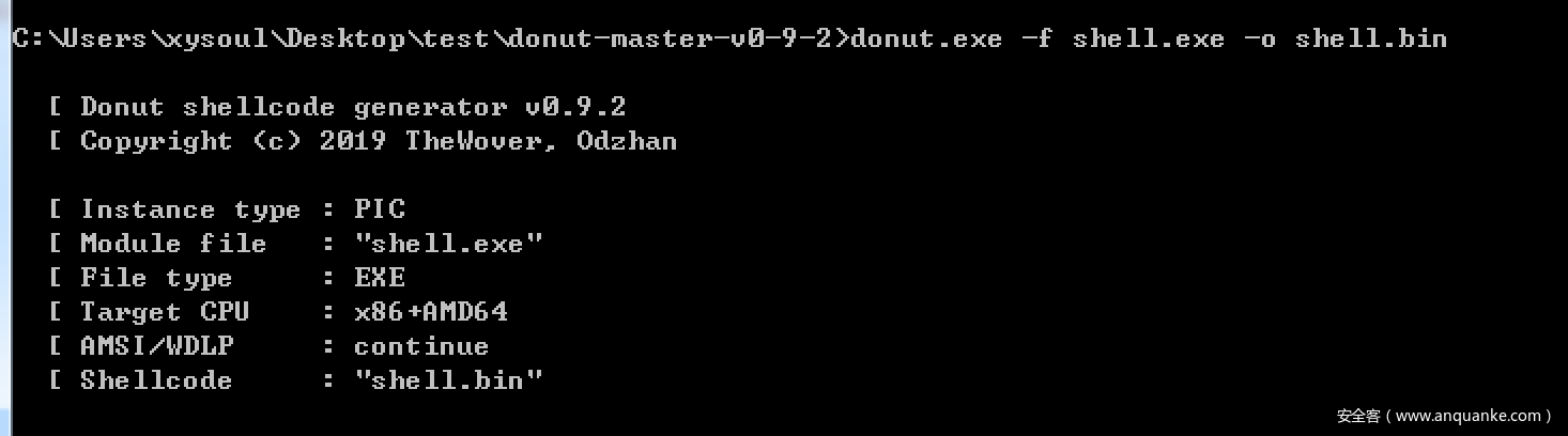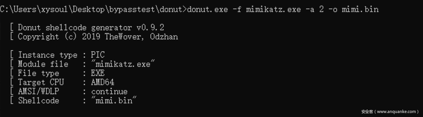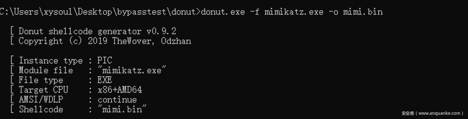1、首先使用Donut对需要执行的文件进行shellcode生成,这里对mimi进行shellcode生成,生成bin文件,等下会用到。经测试,这里我用的Donut_v0.9.2版,0.9.3版生成的bin文件无法加载,不知道什么原因。