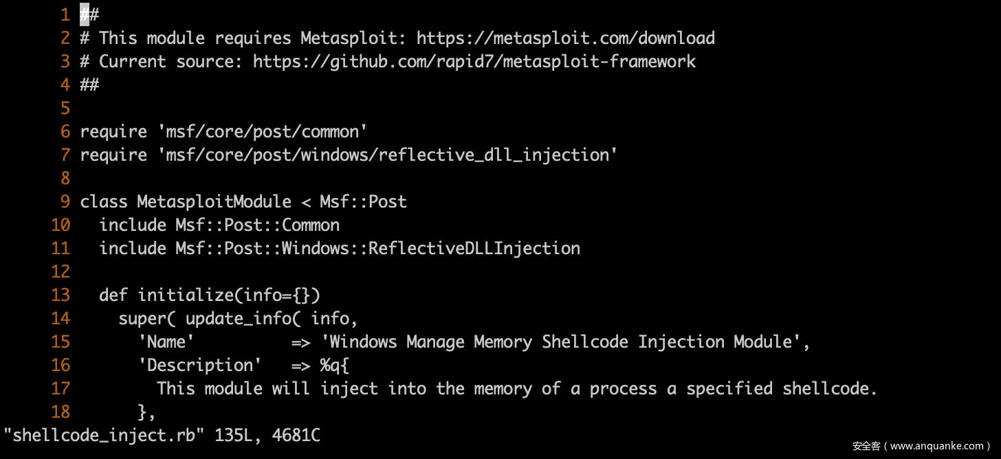 2、将上面的shellcode_inject.rb放入/opt/metasploit-framework/embedded/framework/modules/post/windows/manage下(实际路径可能不同,也就是metasploit-framework的上级路径,根据实际情况调整),然后进入msf,reload_all同时载入所有模块。kali里是在目录/usr/share/metasploit-framework/modules/post/windows/manage/mac下是在/opt/metasploit-framework/embedded/framework/modules/post/windows/manage