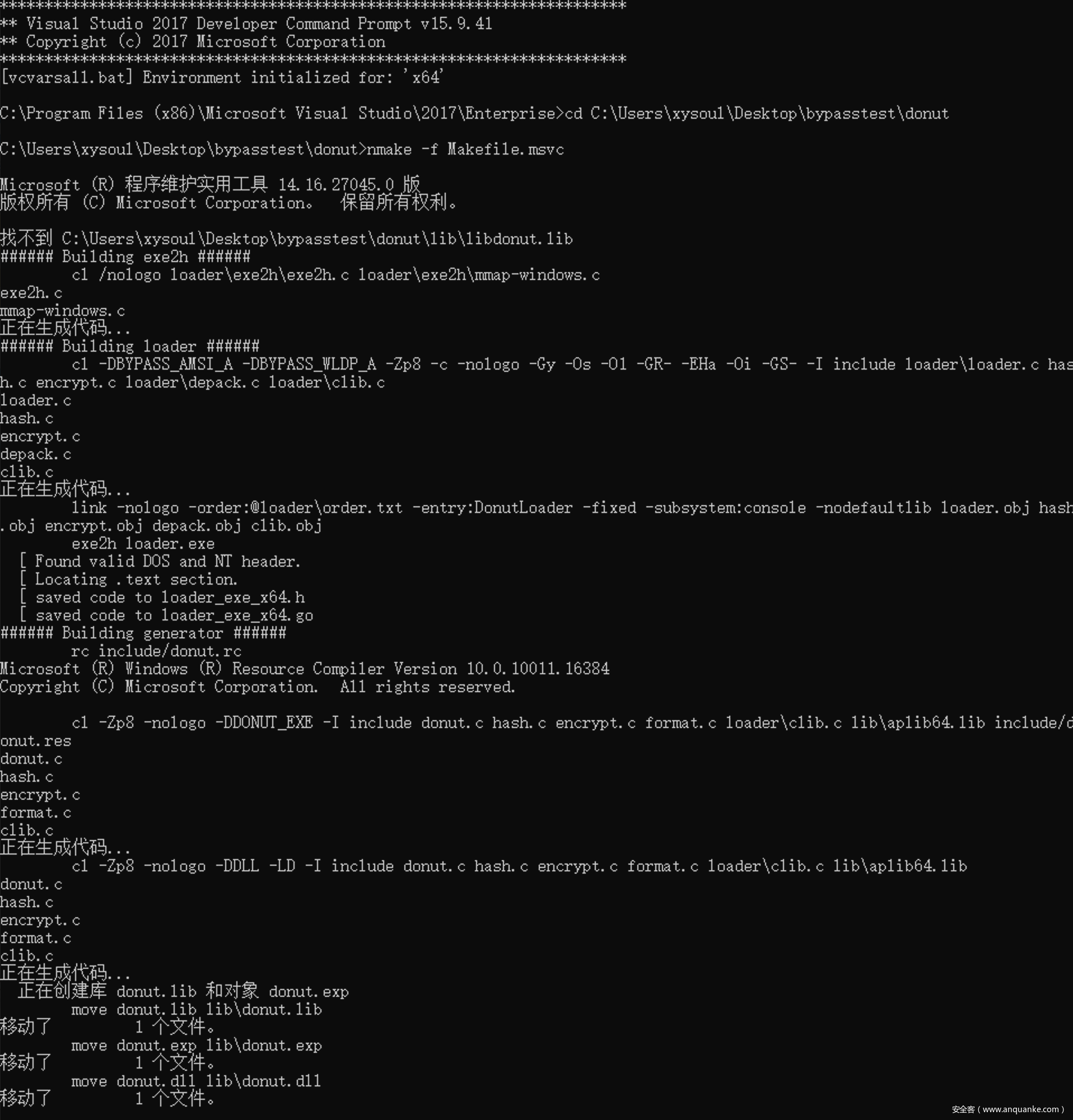 下载https://github.com/TheWover/donut我本机安装的VS2017,在donut目录下执行nmake -f Makefile.msvc进行编译,发现报错。