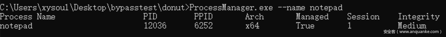 ProcessManager支持对指定进程进行筛选,例如只查看notepad.exe的进行信息,命令如下。notepad.exe进程id为12036。