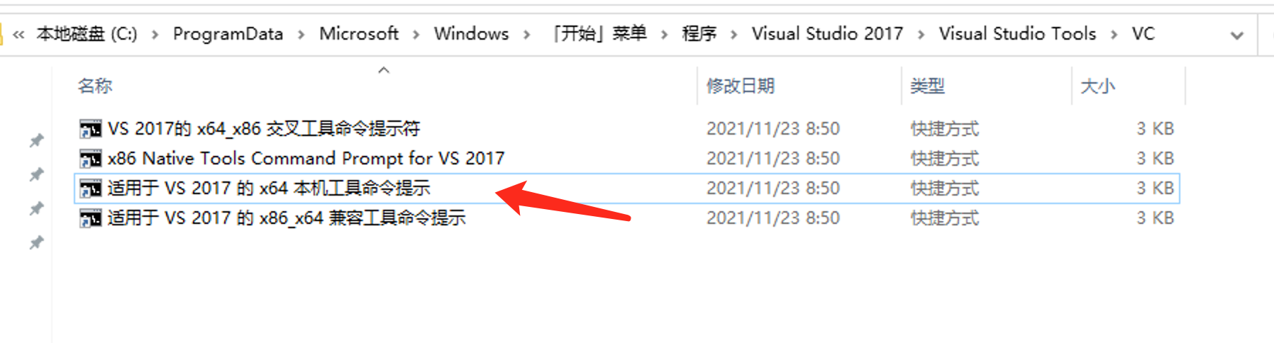 解决方法:在C:\ProgramData\Microsoft\Windows\Start Menu\Programs\Visual Studio 2017\Visual Studio Tools\VC目录中运行适用于 VS 2017 的 x64 本机工具命令提示。