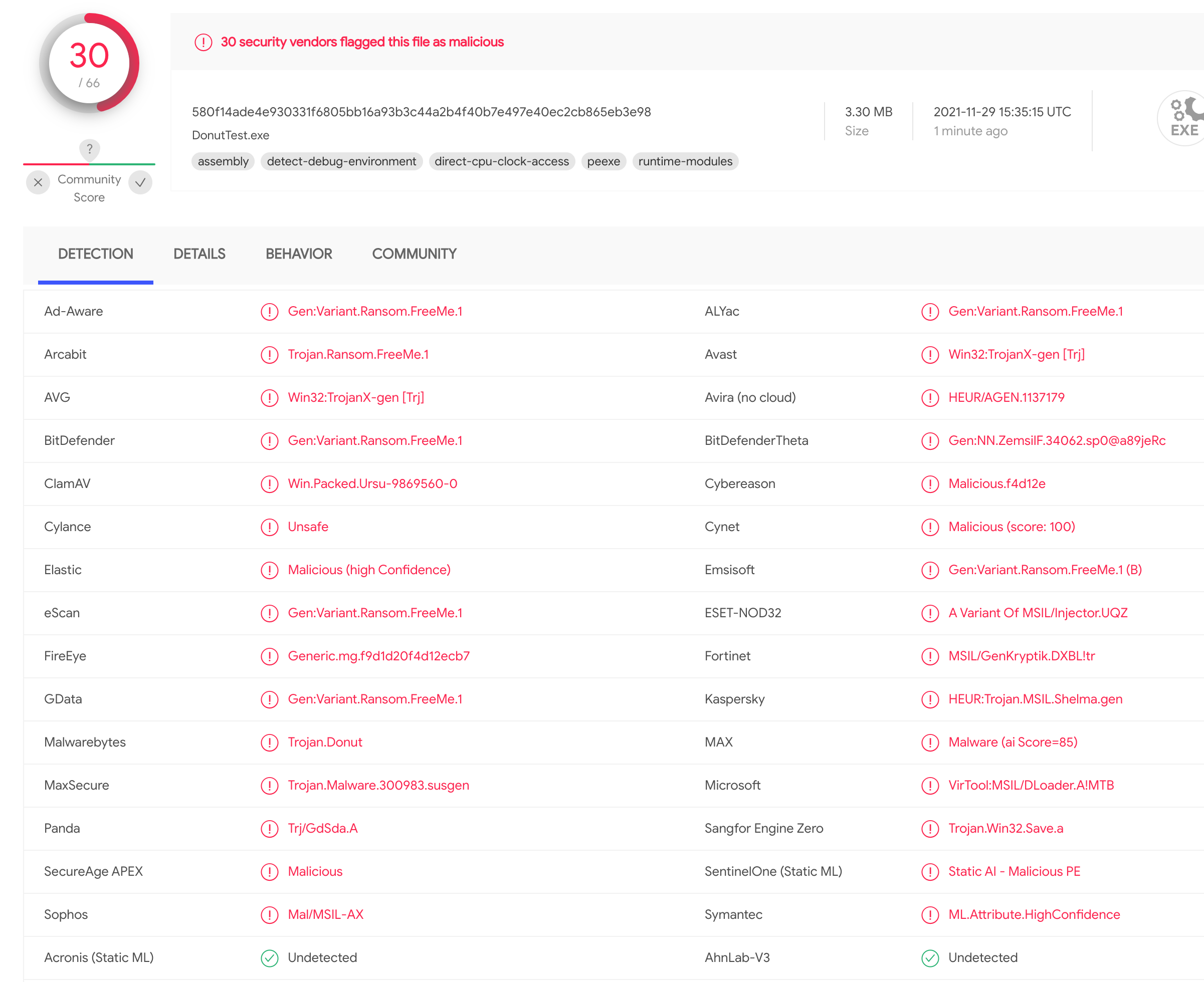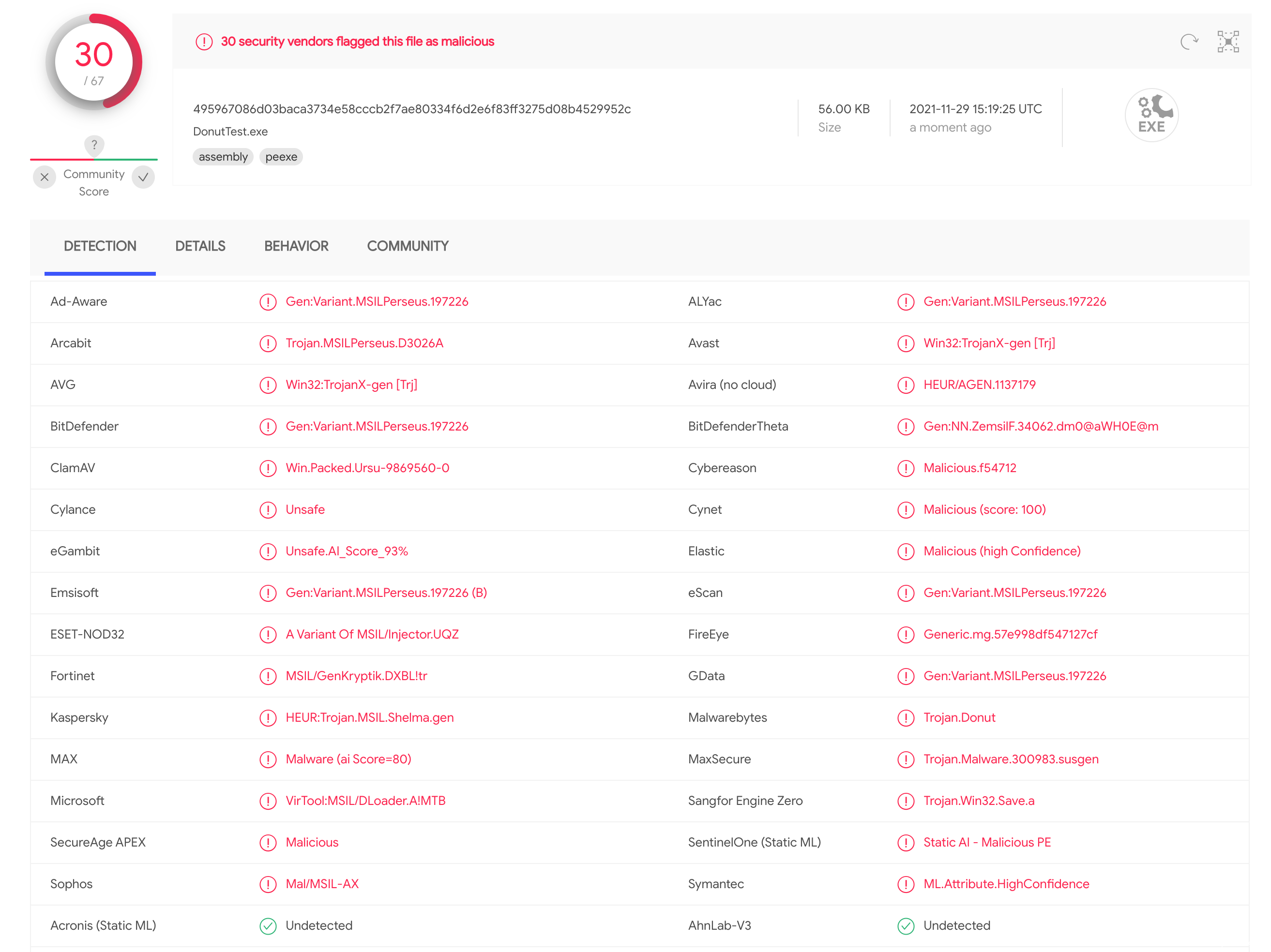 测了半天发现这个donut的免杀效果太差,就这个测试dll,在virustotal.com上大部分都能静态查杀。