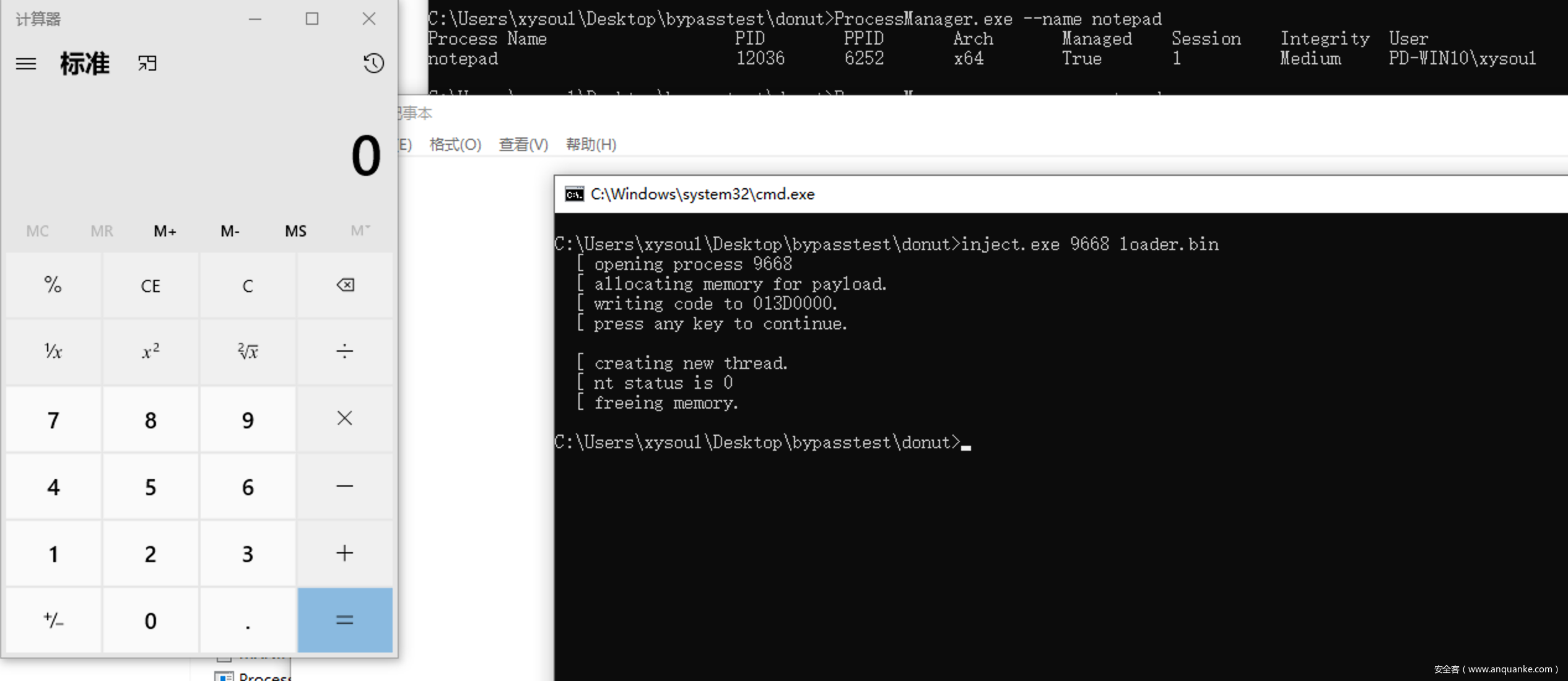 编译生成exe。在注入进程时,发现注入到notepad.exe中无法执行,但注入到powershell中可以执行。