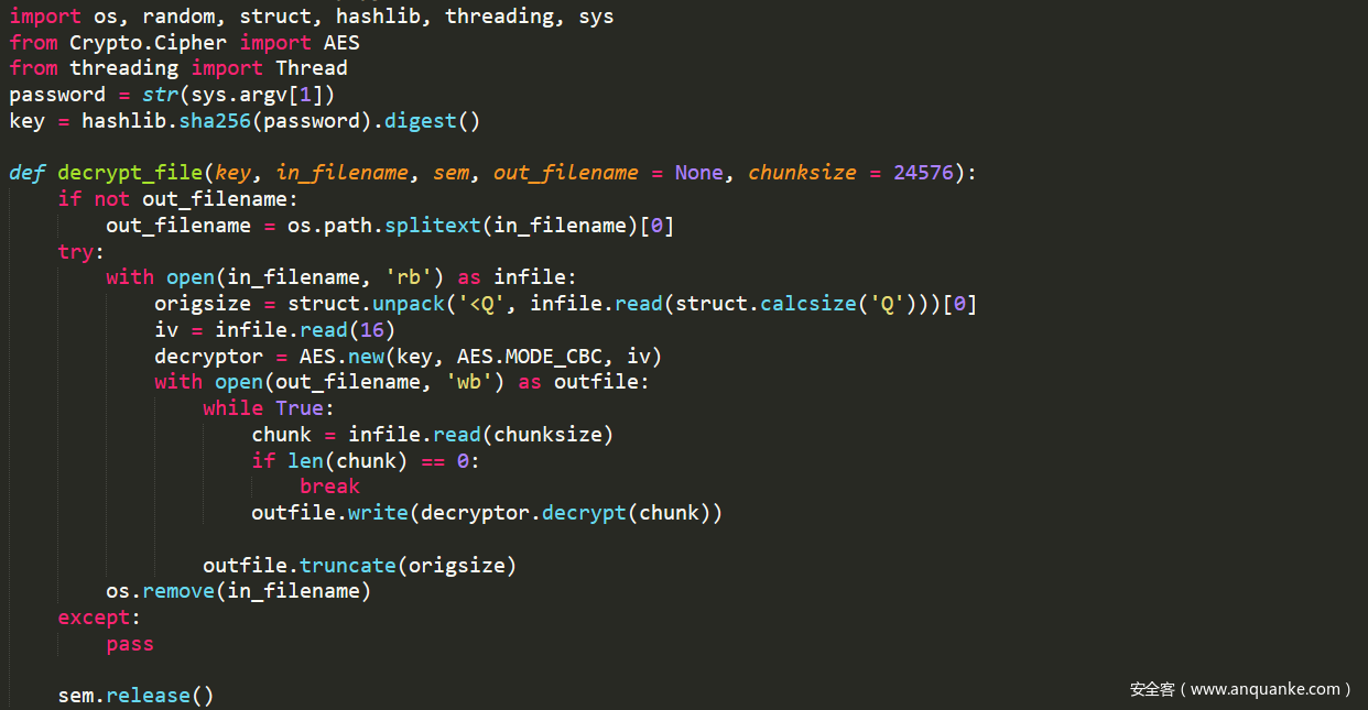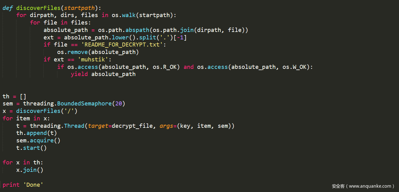 下载解密工具,发现它是使用python脚本编写的,对解密工具进行逆向分析,还原出里面的python脚本,此解密工具会先遍历磁盘,寻找加密的文件或勒索信息文件,如下所示: