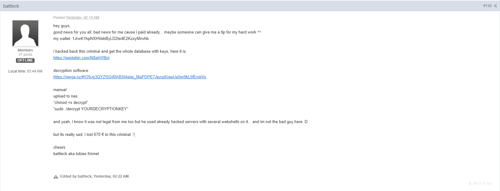 在获取到相应的解密密钥之后,他在论坛发表了这则消息,如下所示: