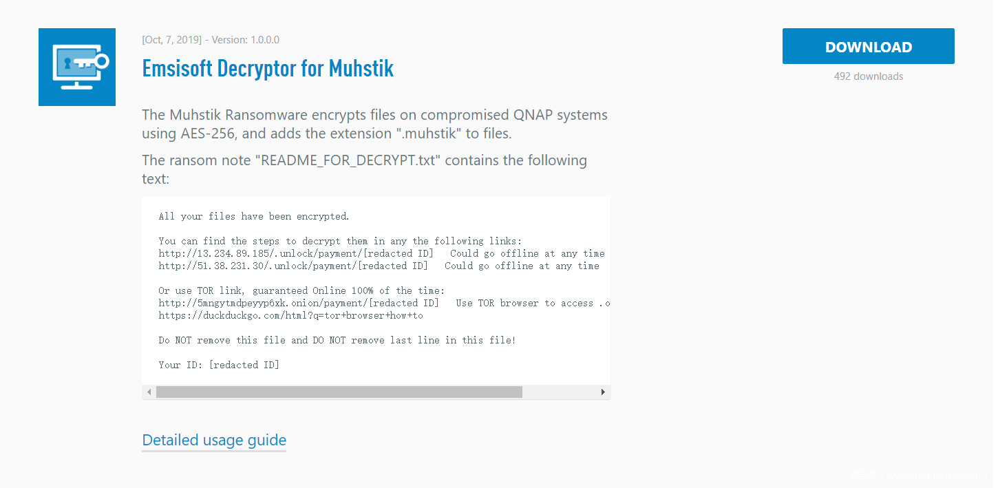 10月7号,Emsisoft也发布了可以运行在Windows平台上Muhstik的解密工具,如下所示: