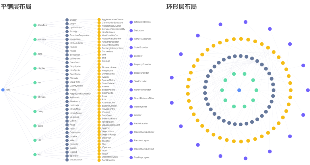 在不同类型的知识图谱中,因数据差异较大,对布局效果的要求也有所不同。能让业务数据有合适的布局来做可视化呈现,是一项比较大的技术挑战。除了下面几种基本的布局之外,我们还探索了一些特定场景下的布局方案。