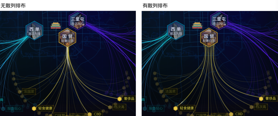 针对这种特殊场景,我们设计了一种多边散列排布的算法,通过边夹角偏移量计算和节点半径裁剪,将Nexus分散排布在节点周围,减少边线重叠的情况,以达到更清晰的视觉效果: