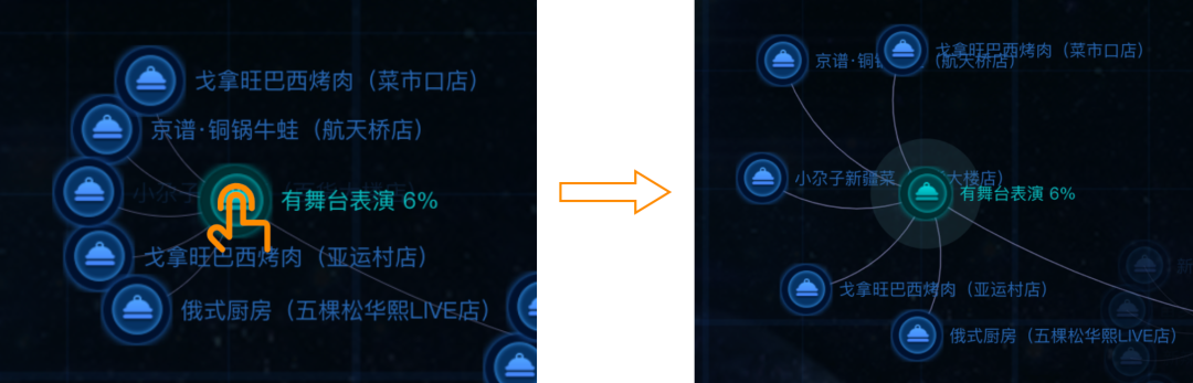 除了上述的基础交互功能外,我们还探索了一些特殊场景的交互。在图谱可视化中交互的目的,是为了从庞大的知识图谱中找到自己关心数据的关联关系,同时也能够观察到这些关联关系在全局画布中的位置。