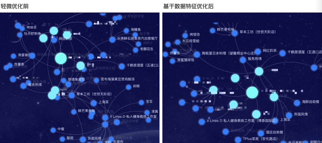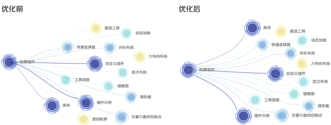 对于当前不关注的图谱区域,默认布局可以密集一些来节省画布空间,关注某个区域后,会对当前关注的一小块区域重新布局,让节点排布分散一些,方便查看文字的内容。