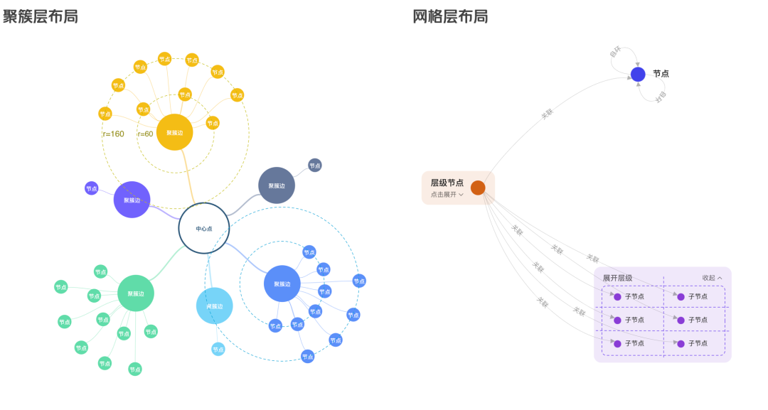得益于D3.js力学布局的灵活性和拓展能力,我们在业务实践的过程中实现了几种常用的布局方案: