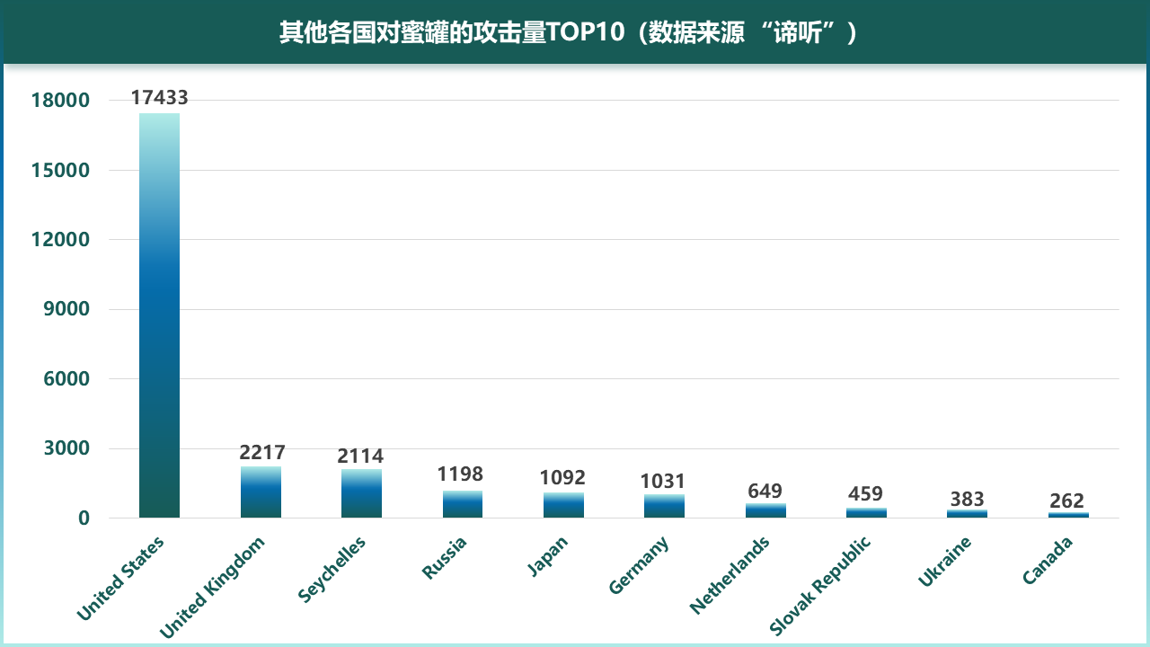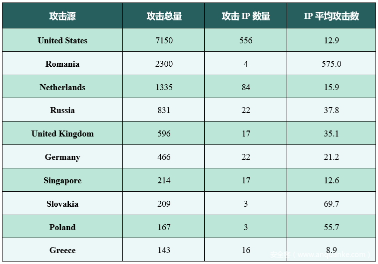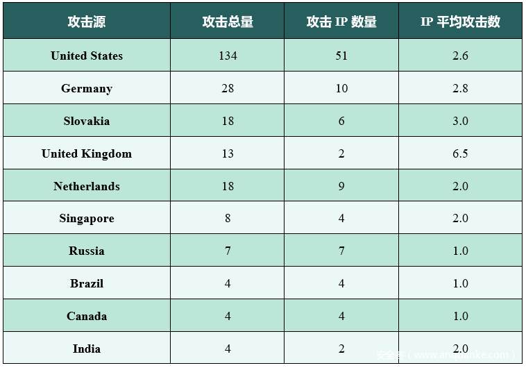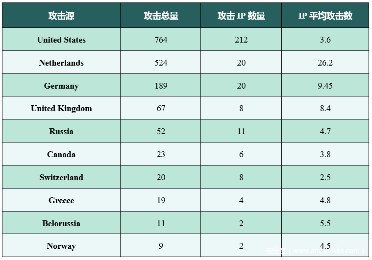 表6-2 美国东海岸地区Modbus协议蜜罐捕获攻击总量来源TOP10(数据来源“谛听”)