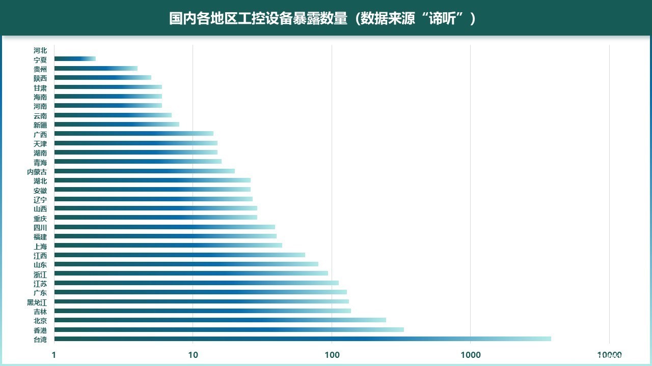 图 5-4 国内各地区工控设备暴露数量(数据来源“谛听”)