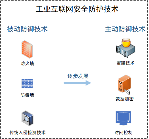 首先,工业互联网安全防护技术是对工业互联网各层级部署边界控制、身份鉴别与访问控制等的技术措施,是工业互联网安全技术的核心。此前,在安全防护理念上,主要是以被动防御为主,近年来,主动防御的理念逐渐成为主流。与防火墙、防毒墙、传统入侵检测技术等被动防御技术相比,主动防御技术在目前应用更为广泛,其能够在入侵行为对信息系统发生影响之前,及时精准预警,实时构建弹性防御体系,避免、转移、降低信息系统面临的风险。主动防御技术主要有数据加密、访问控制、蜜罐技术、新型入侵检测技术等。在工业互联网中,也可采取以白名单技术为主、黑名单技术为辅的安全防护机制,这样就能提高对风险防护的效率。