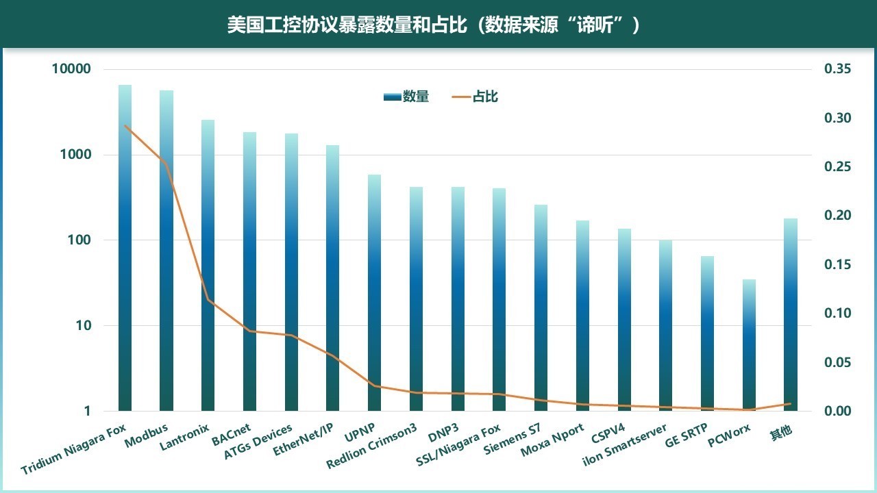 图5-2 美国工控协议暴露数量和占比(数据来源“谛听”)