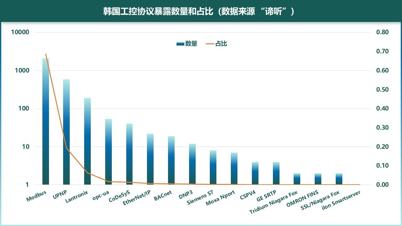图5-3 韩国工控协议暴露数量和占比(数据来源“谛听”)