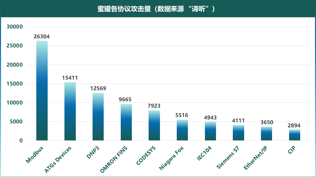 “谛听”团队选取了Modbus、Ethernet/IP两个应用范围较广的协议进行攻击流量检测,并从每个协议在不同地区部署的蜜罐中选择最具代表性的两个地区进行攻击流量数据统计。