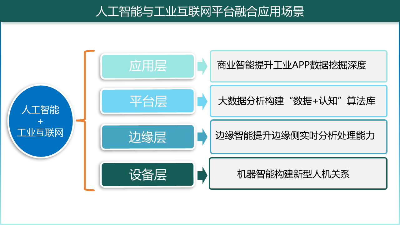 设备层:机器智能构建新型人机关系。工业互联网平台在企业生产中应用广泛,人工智能技术以工业互联网平台为依托,在整个生产研发过程中逐步建立人机协同的新型人-机-物关系。一是设备运行智能化,如自动物品分拣、设备自主启动运行等。厂内设备通过搭载封装了人工智能算法的控制终端,实现对复杂工况的自适应,如物流运输自动规路径,机械臂高精度物品检测等。二是人机交互智能化。当前工控设备人机交互方面的功能并不被重视,学习成本高,用户不友好是一大问题。通过使用语音识别、动作识别等新兴人机交互技术,可以大幅度优化人机交互模式,降低设备的使用难度与操作复杂度,最终提高生产效率。三是生产运作智能化,比如协作机器人、仿生工位等。人机合作场景将会被人工智能算法学习,持续性的调整参数,优化执行逻辑,为操作员提供最便捷的生产环境。