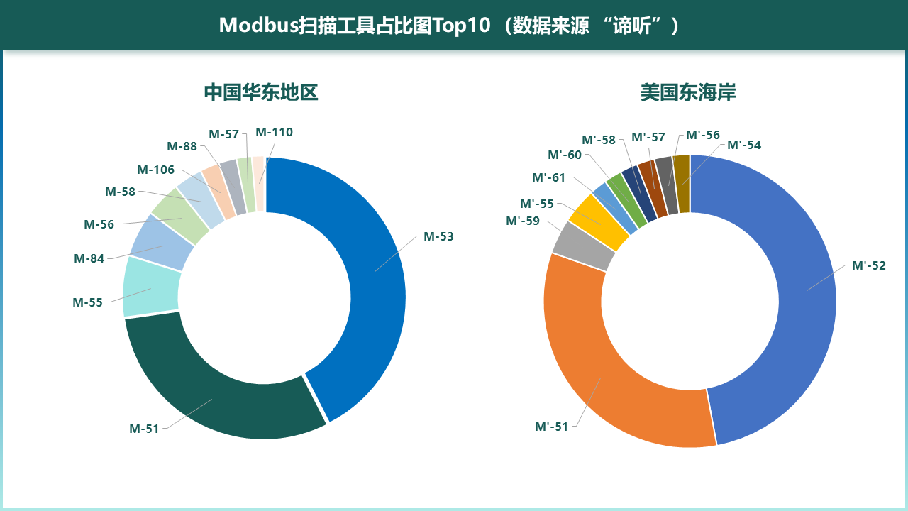 由图6-5可知,中国华东地区的Modbus协议蜜罐捕获的攻击流量主要来自于流量模式为M-53(43%)、M-51(30%)、M-55(7%)、M-84(5%)、M-56(4%)、M-58(3%)的扫描工具。美国东海岸Modbus协议蜜罐捕获的攻击流量主要来自于流量模式M’-52(47%)、M’-51(33%)的扫描工具。可见以上流量模式的扫描工具是对Modbus协议进行扫描的主要工具。本团队对Ethernet/IP和Modbus的ICS网络流量进行了解析、建模、评估,但其中还存在部分未知的流量模式,针对未知的流量模式还需进一步的研究,以便提供有效的ICS流量检测与攻击预警,评估其潜在的攻击意图,制定针对性的防御措施。