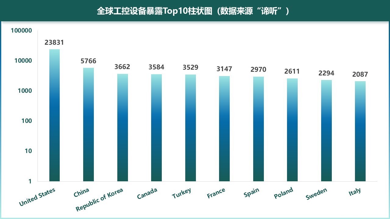 图5-1 全球工控设备暴露Top10柱状图(数据来源“谛听”)