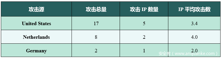 在Modbus协议蜜罐和Ethernet/IP协议蜜罐总计捕获的攻击方来源数据中,我们不难发现,Ethernet/IP协议蜜罐受攻击的总次数远小于Modbus协议蜜罐,可能是因为当前Modbus协议应用更广泛,开源工具较多,技术门槛较低,易于部署和维护,因此针对Modbus协议的攻击更多。此外,在确定攻击源的情况下,排名前三的国家的攻击方来源数占总数的近90%,可能有以下三个原因:一是可能由于这些国家的公司提供的云服务器被租赁用于长期扫描,二是可能由于这些国家的安全行业相关人员及研究者较多,三是可能由于这些国家存在大量恶意攻击者。