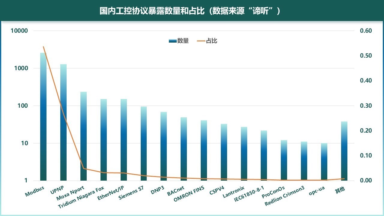 图5-5 国内工控协议暴露数量和占比(数据来源“谛听”)