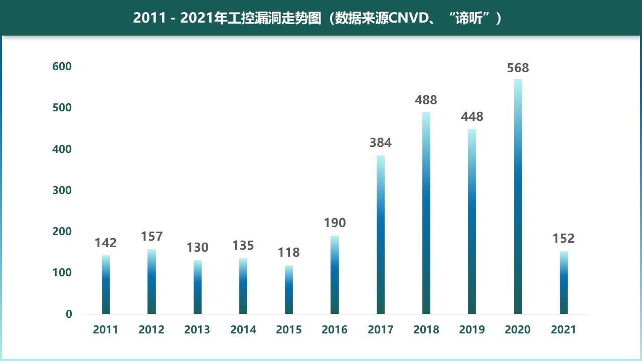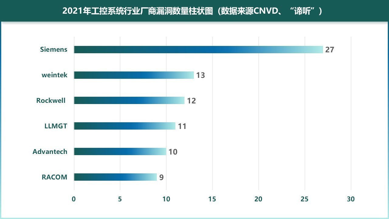随着5G网络的不断普及、物联网设备的应用和工业互联网的发展,传统设备渐渐被智能化设备取代,工控设备遭受到更多的攻击,工控系统安全事件频发。但在今年下半年,漏洞数量突然大幅度下降。工控设备遭受攻击的形式越来越多样,其中,最常见的攻击方式就是利用工控系统的漏洞。PLC(Programmable Logic Controller,可编程逻辑控制器)、DCS(Distributed Control System,分布式控制系统)、SCADA(Supervisory Control And Data Acquisition,数据采集与监视控制系统)乃至应用软件均被发现存在大量信息安全漏洞。西门子(Siemens)、威纶科技(weintek)、罗克韦尔(Rockwell)、唐山市柳林自动化设备有限公司(LLMGT)、研华科技(Advantech)等工业控制系统厂商也均被发现包含各种信息安全漏洞。
