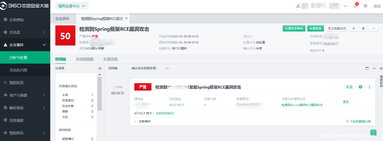 360(云)主机安全防护系统针对本次爆发的Spring远程代码执行漏洞,对相关的业务框架和系统逻辑进行分析研判,并在第一时间提供了相关处置方案,受影响的用户可通过下发相关策略检测并修复该漏洞: