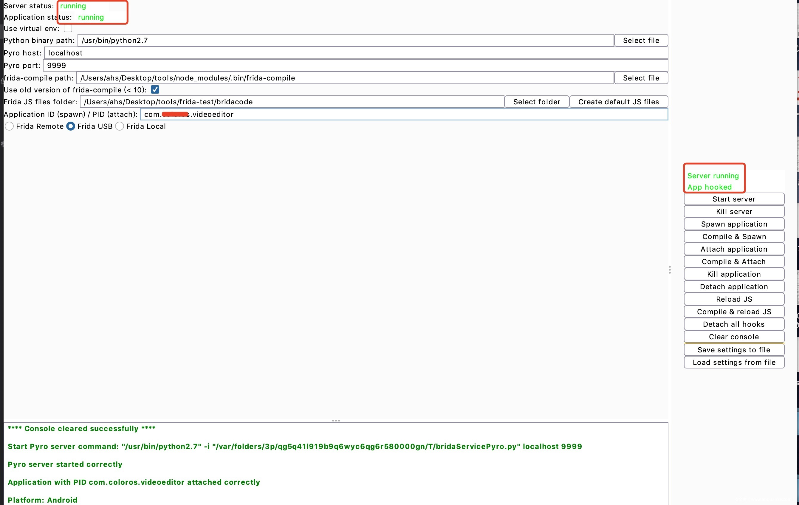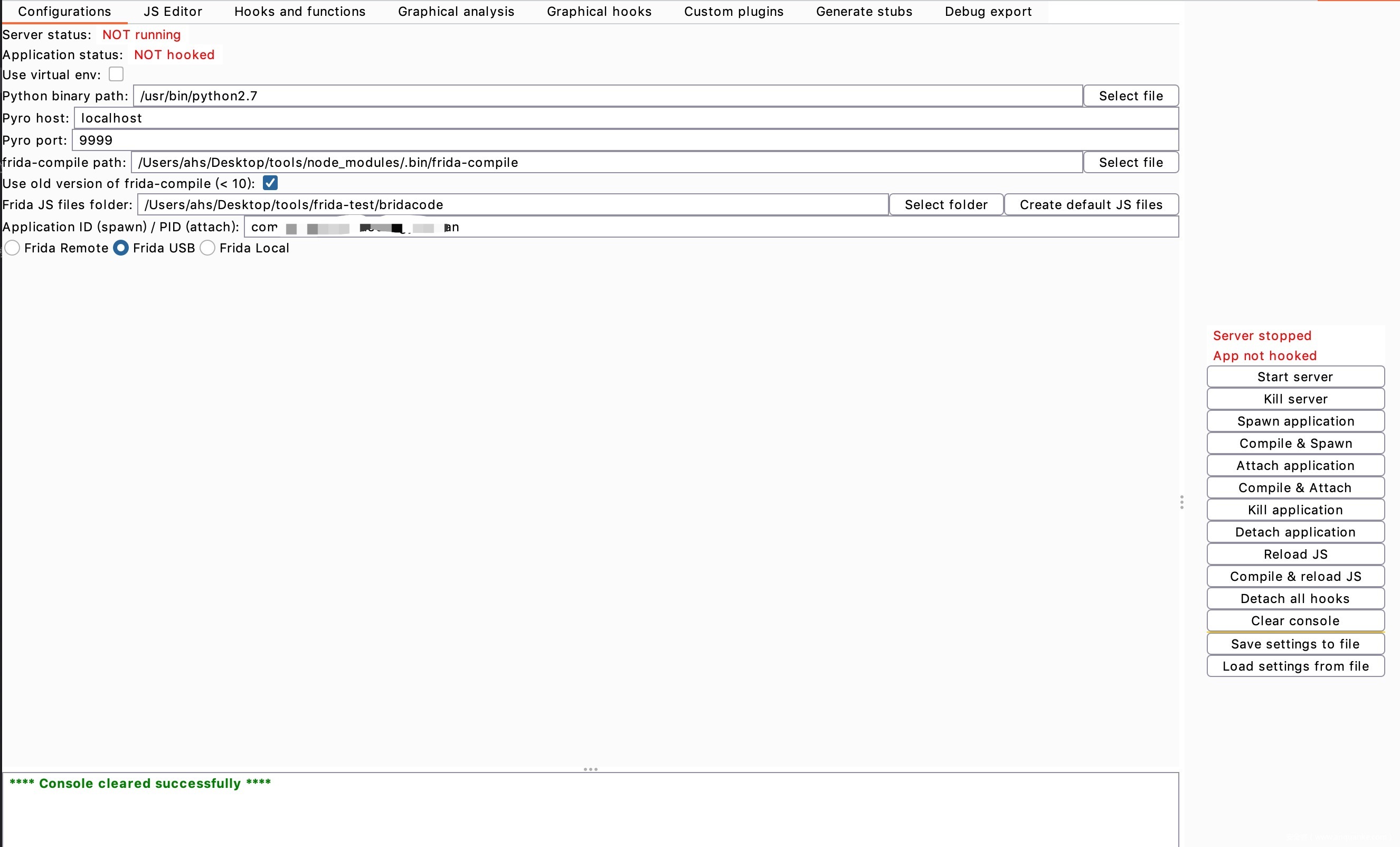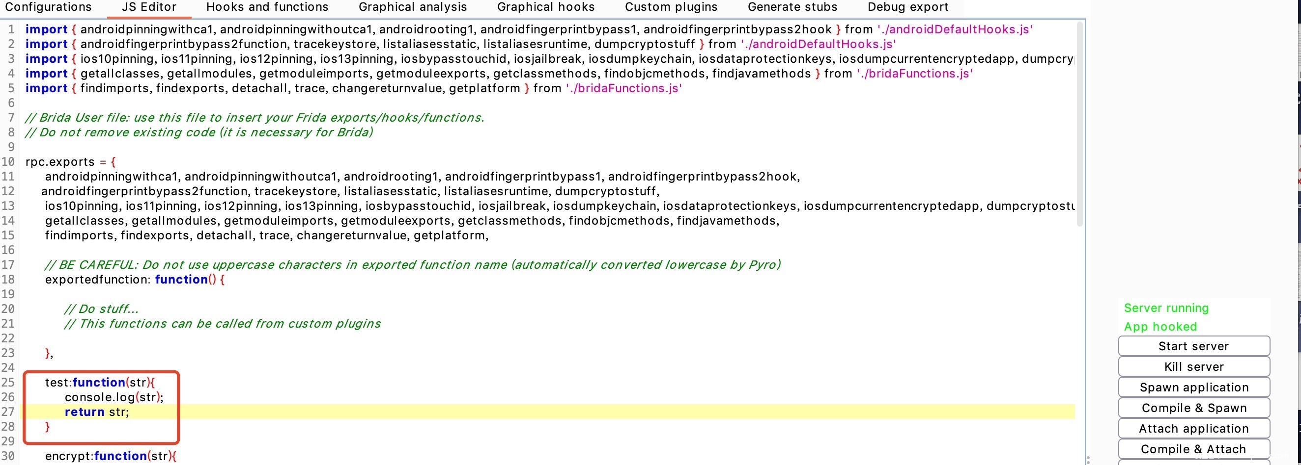 然后在JS Editor中测试下js脚本能不能执行,模板用前面指定的Frida JS files folder目录下的Brida.js。