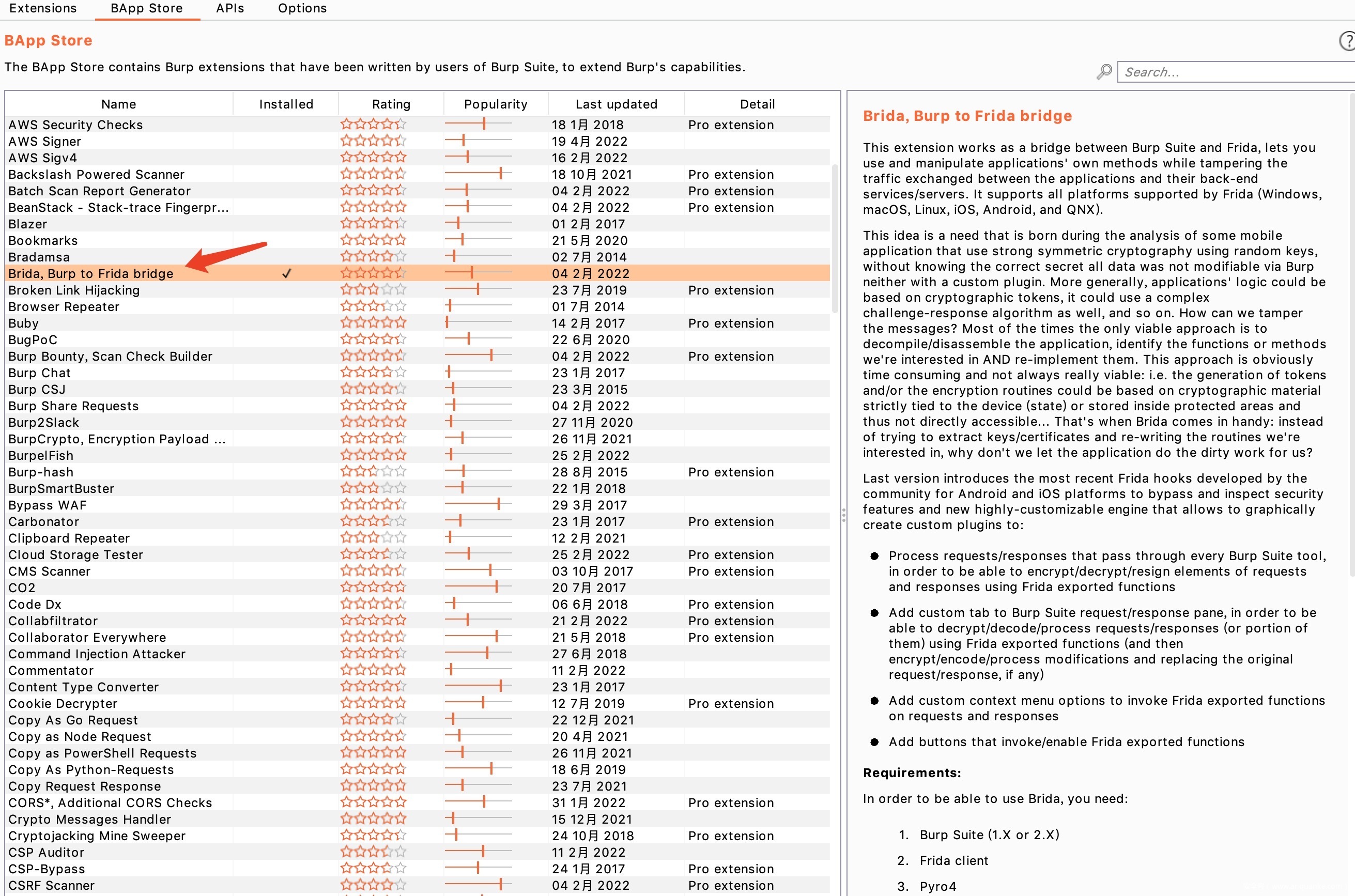 Brida是Burp中的一个插件,它可以把Burp和Frida结合起来使用,简化测试流程,通过Brida能在Burp中直接调用目标app中的加/解密函数,进行参数修改测试更多的输入点。