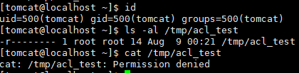 假设A用户名为tomcat,改文件只允许属主root和其他用户tomcat访问(只读) 设置acl前,tomcat用户读取操作被拒绝。