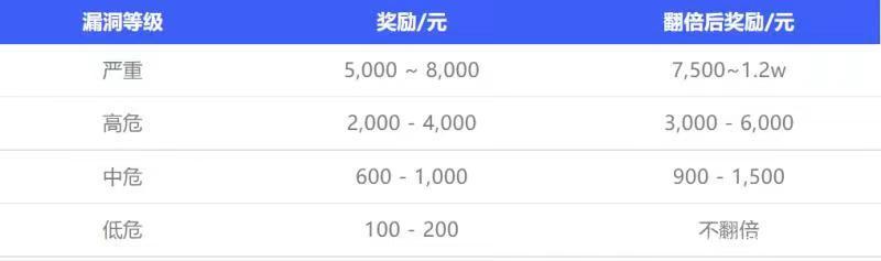 漏洞等级:活动时间段内且漏洞评级为有效中危及以上漏洞进行翻倍奖励。
