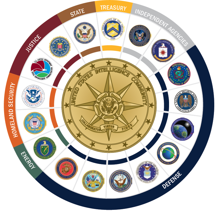 ·七个部门与机构:能源部情报和反间谍办公室、国土安全部情报和分析办公室、美国海岸警卫队的情报和反情报部门、美国司法部联邦调查局、缉毒局国家安全情报局、国务院情报和研究局以及财政部情报和分析办公室。