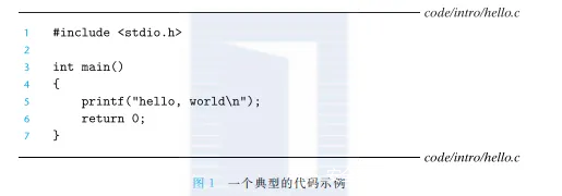 文中每段代码示例都是由经过GCC编译的C程序直接生成并在Linux系统上进行了测试,没有任何人为的改动。当然,你的系统上GCC的版本可能不同,或者根本就是另外一种编译器,那么可能生成不一样的机器代码,但是整体行为表现应该是一样的。所有的源程序代码都可以从csapp.cs.cmu.edu上的CS:APP主页上获取。在本书中,源程序的文件名列在两条水平线的右边,水平线之间是格式化的代码。比如,图1中的程序能在code/intro/目录下的hello.c文件中找到。当遇到这些示例程序时,我们鼓励你在自己的系统上试着运行它们。