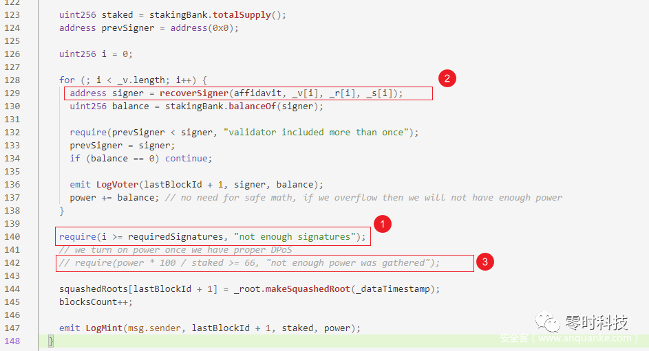 ①处只对签名数量进行校验,但并未对②处获取的签名地址有效性进行判断,从而可以使用任意数量的地址签名绕过;③必要的校验语句被注释掉,故未对投票数进行校验,这几处问题合在一起导致了 submit 函数可被任意人员调用。