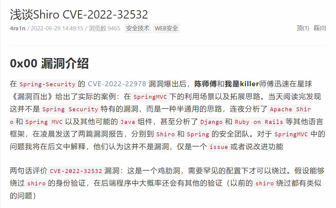 从漏洞分析的角度来讲,CVE-2022-32532 和CVE-2022-22978的原理其实很简单,那从漏洞发现和挖掘上看,在了解了类似于CVE-2022-22978这样的安全漏洞后或者是其他的过程发现一些特性,拓展到其他框架或组件中去寻找类似的安全问题,构造利用场景,这是无疑一种高效挖洞的方法。一些未知由语言特性、机制特性等引发的安全漏洞,也等着我们去发现和研究。