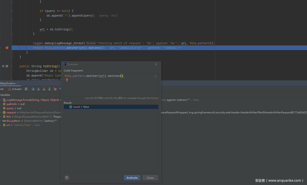 在spring-security中利用换行符可实现权限认证进行绕过,\r的URl编码为%0d,\n的URL编码为%0a