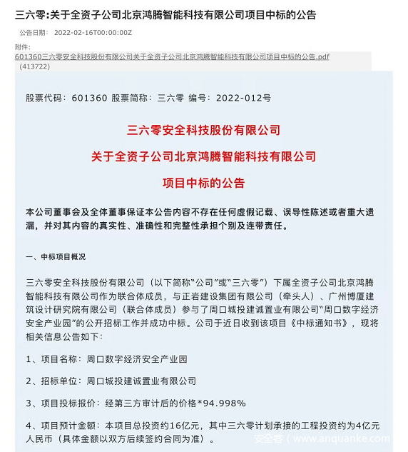 2月16日,三六零(股票代码:601360.SH)旗下的360政企安全集团与河南省周口市人民政府达成战略合作,成功中标4亿元周口数字城市安全大脑项目。双方将共同打造周口数字城市安全大脑,集中建设网络安全基础设施赋能多个数字化应用场景,为周口市建设中原崛起新高地增添新动能。