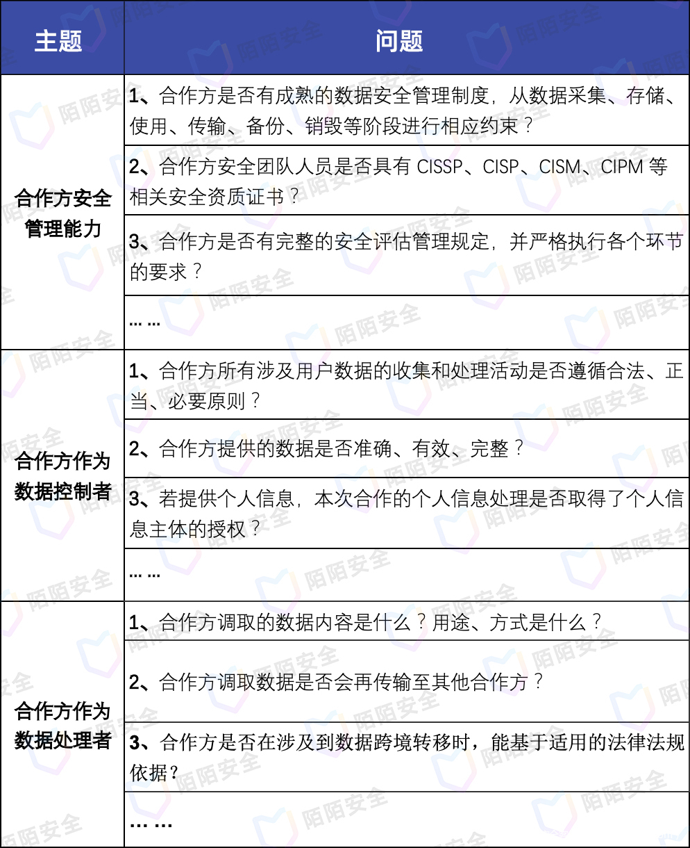 SDK使APP开发者的开发工作更加高效便捷,但由于第三方不可控也会导致大家频频踩雷。看到大家都在不约而同地求问SDK避雷妙招,我们只能真诚地建议在接入SDK时要擦亮眼睛,细细盘问,做好尽职调查。尽职调查可从合作方安全管理能力以及作为数据控制者、数据处理者等不同层面来评估,举例如下:
