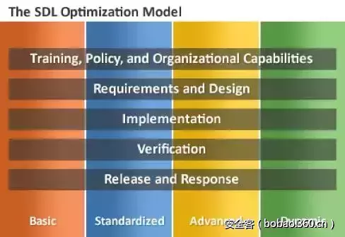 SDL 优化模型围绕5个功能领域构建,这些领域大致与软件开发生命周期的各个阶段相对应:培训以及政策、组织功能、要求和设计、实施、验证、发布和响应。针对这些领域中的实践和功能,SDL 优化模型还定义了四个成熟度水平——基本、标准、高级和动态。其结构如下图所示。