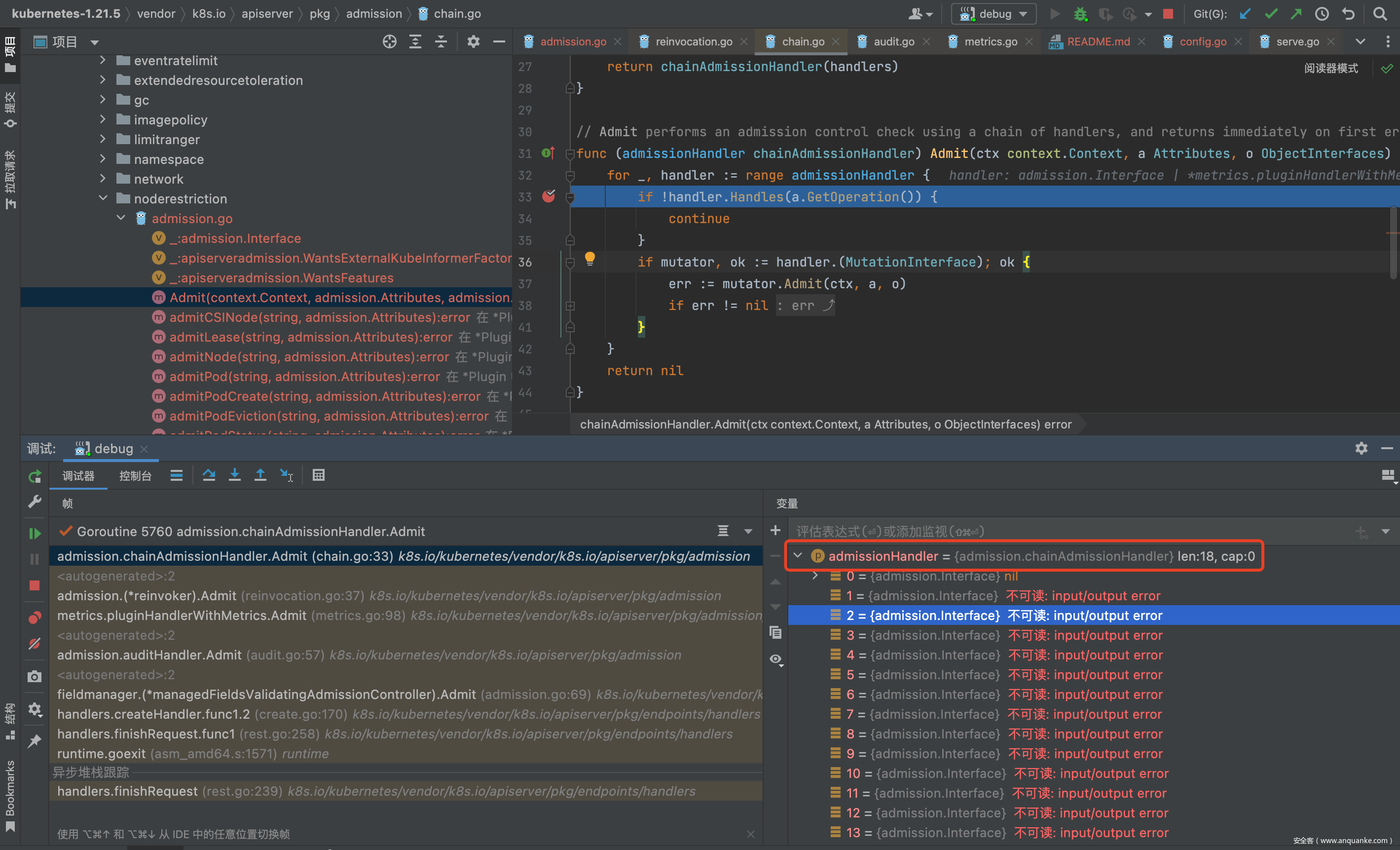 可以看到 admissionHandler切片长度是18,17个”默认开启的准入控制器”加上NodeRestriction