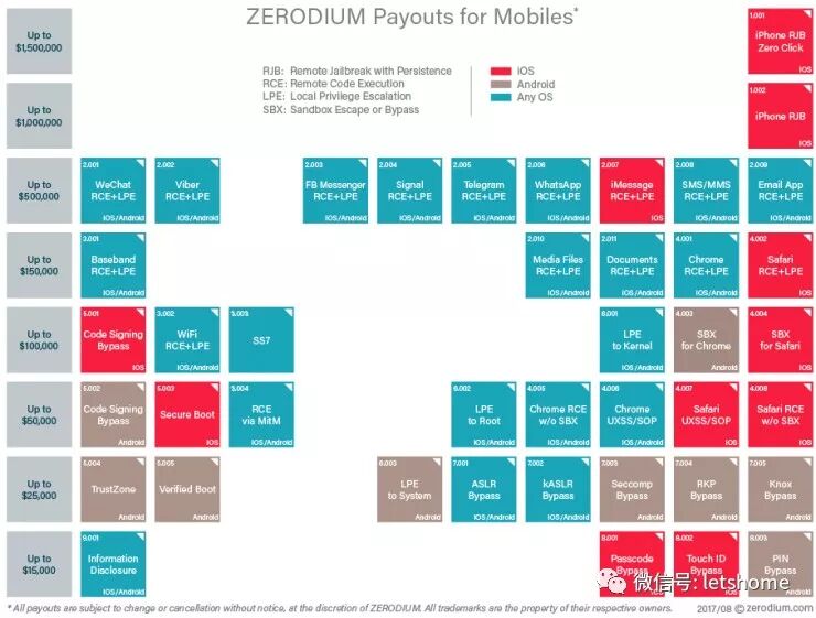 例如,世界著名漏洞军火商 Zerodium 最近表示愿意出价150万美元购买一套完整的 iPhone(iOS)持续性攻击的远程越狱漏洞,即在没有任何用户交互的情况下,远程感染目标设备。现在,你估计会对黑客陈良有不一样的认识了吧,黑客陈良首次揭秘如何越狱 iPhone X :乔布斯的苹果终有缺口。